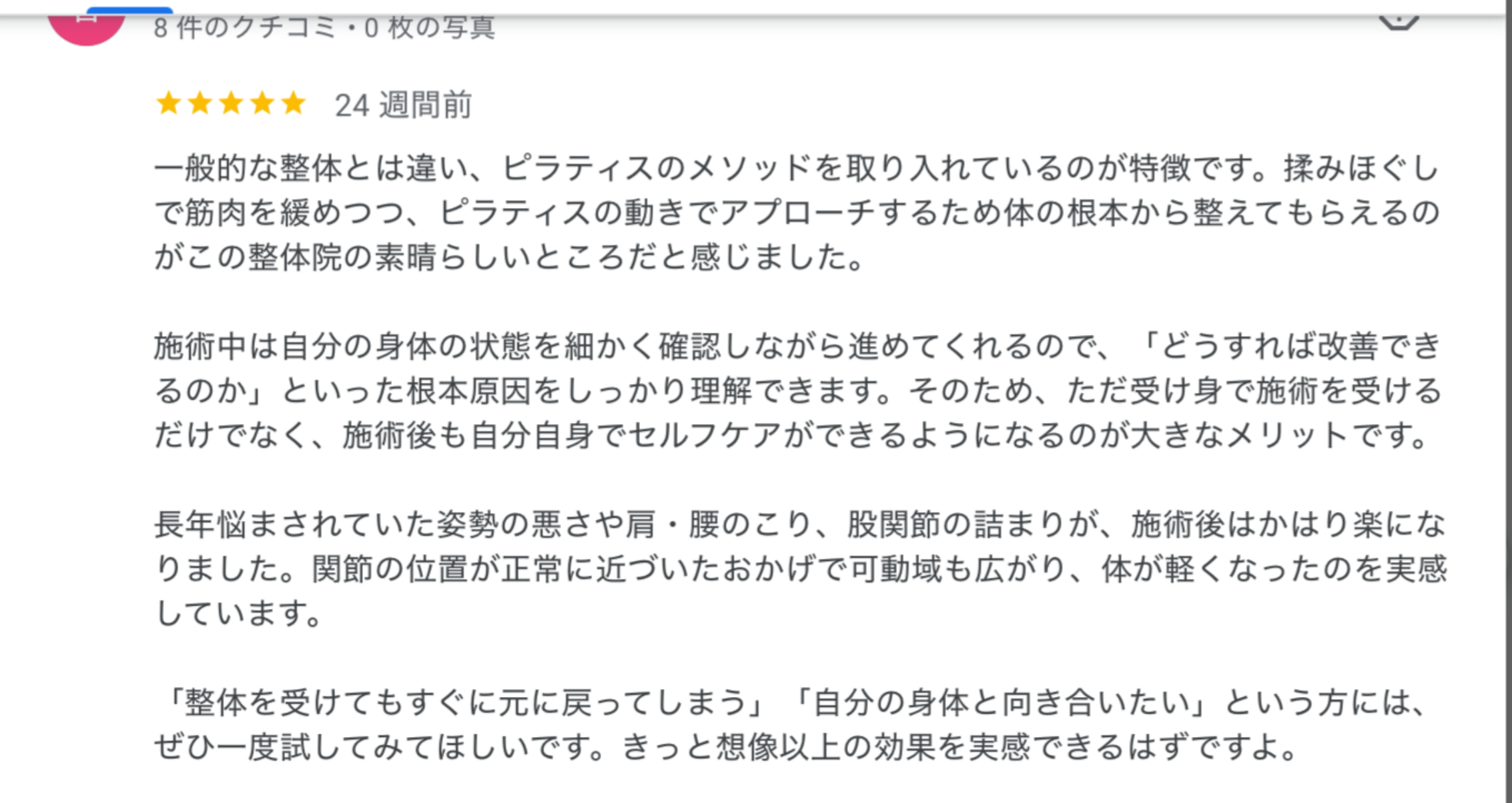 リラクゼーションともみほぐしにピラティスの運動療法を融合した整体で、マッサージ通の方にも好評の“痛気持ちいい”手技を提供。