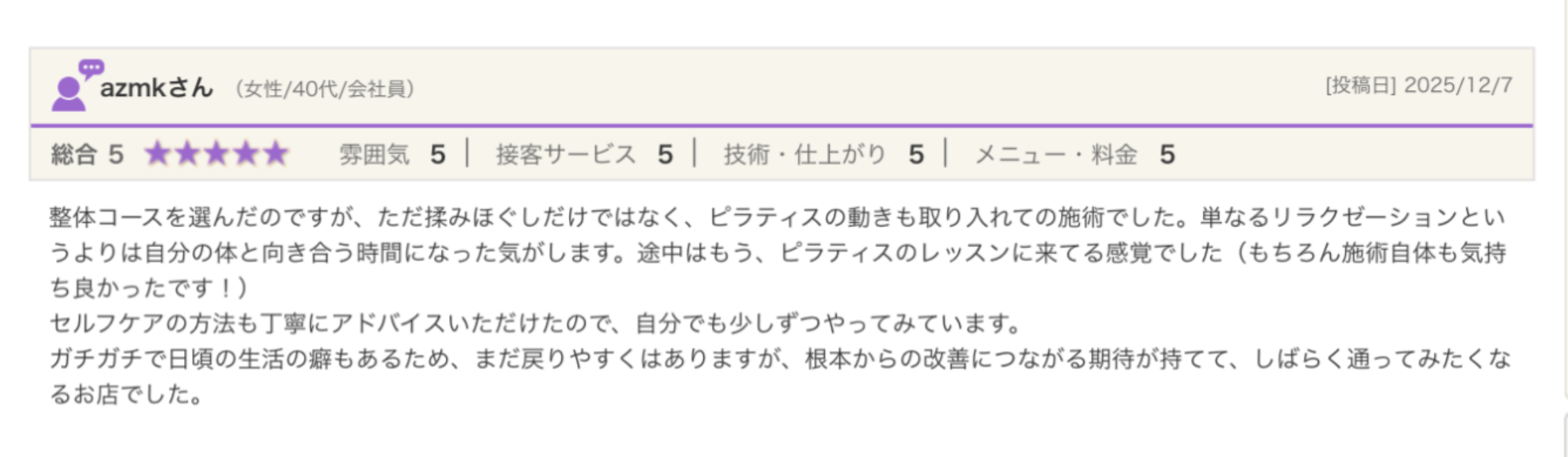 日々の疲れを癒すだけでなく、「動きやすさ」や「軽さ」を実感できる施術が特徴です。